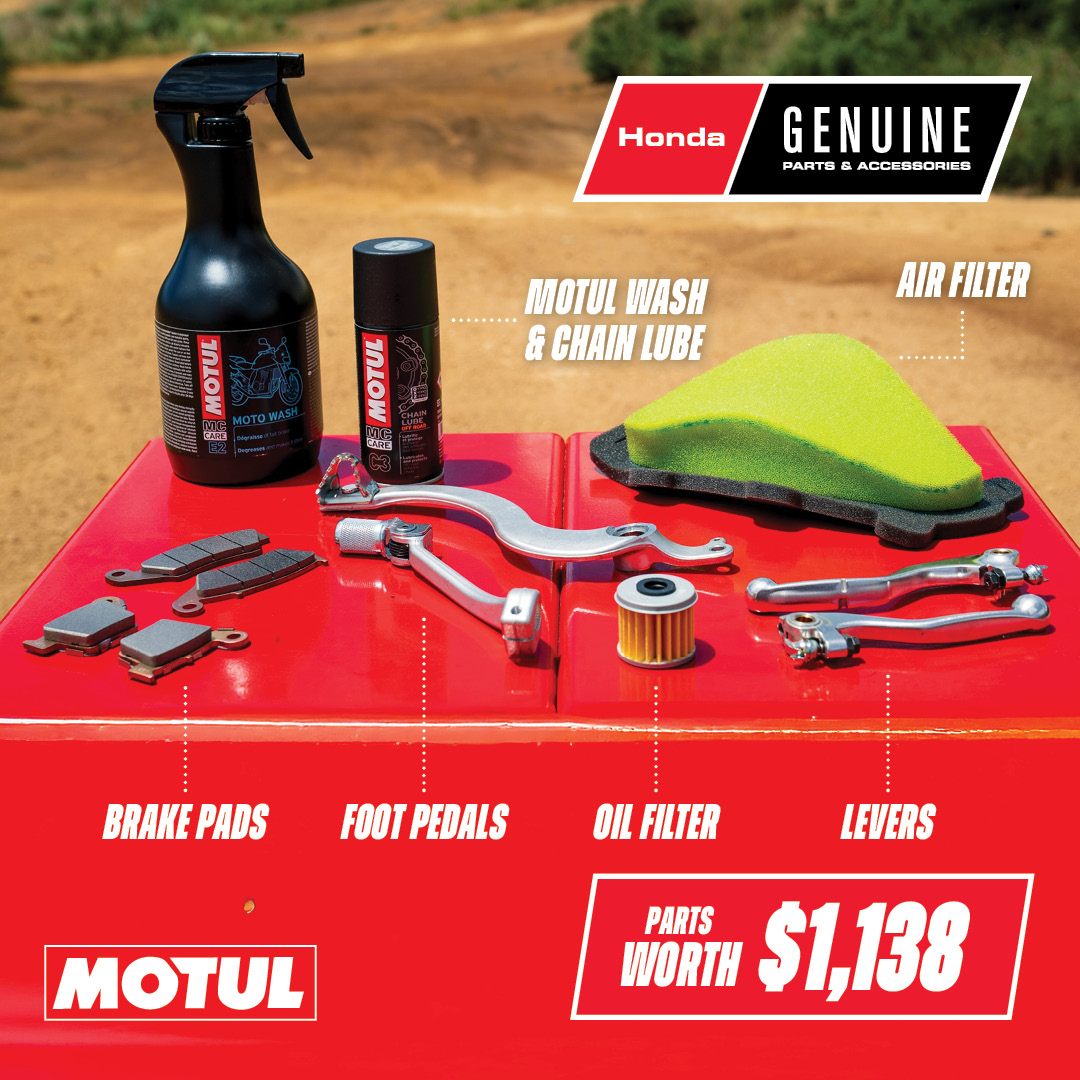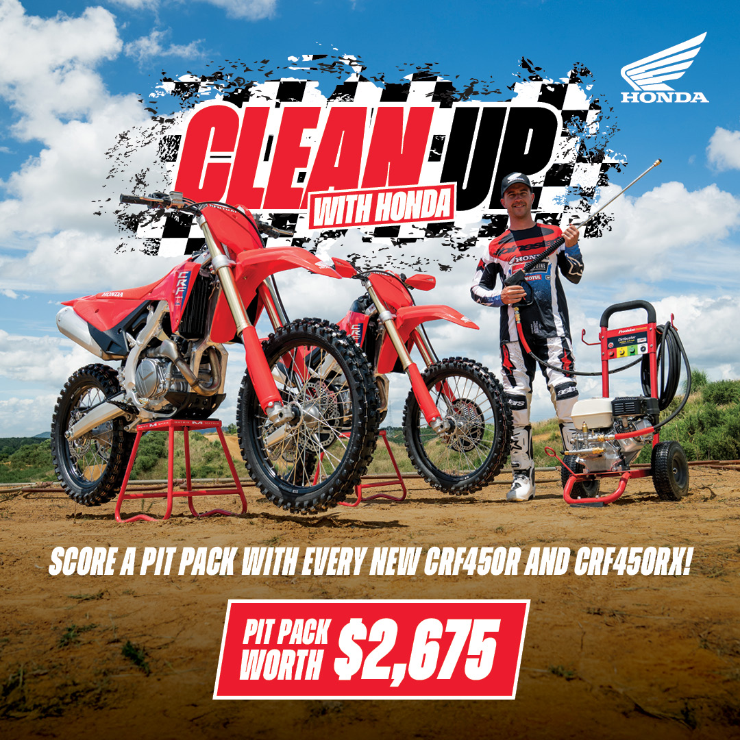 Get on a new Honda CRF450R or CRF450RX and score a pit pack including a Dirtbuster water blaster, Matrix stand, genuine spares and Motul wash & lube.